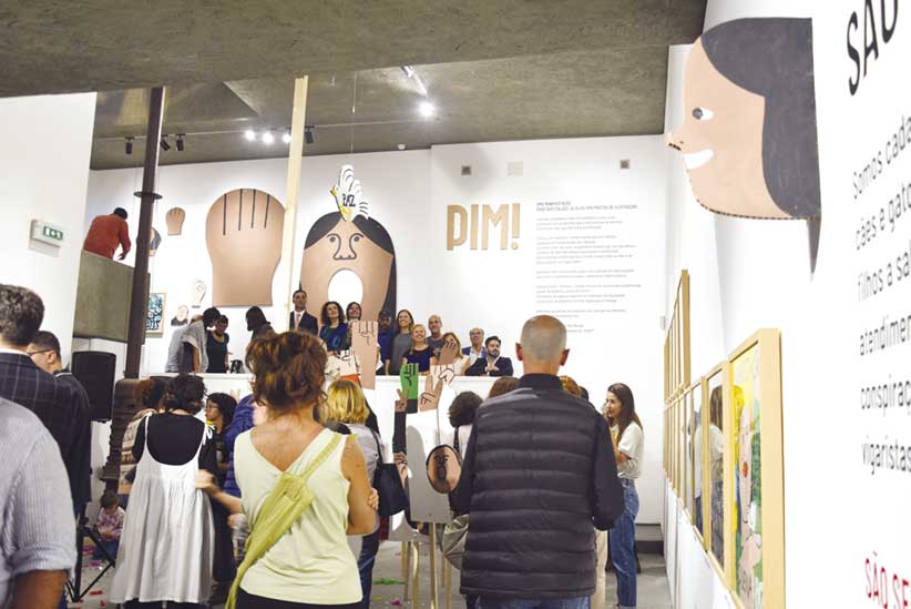 A galeria Nova Ogiva é, por estes dias, um lugar de manifestação. Este ano o coletivo de ilustração, composto por 67 ilustradores internacionais e nacionais, foi convidado a escolher a sua causa, enchendo o espaço cultural com palavras de ordem, inquietações e cartazes a convocar para as mais diversas causas. Mantraste, o ilustrador residente deste ano fez também da galeria a sua casa da Pequena Paz, como pode ser apreciado na PIM! IX Mostra de Ilustração para Imaginar o Mundo. O artista caldense, que considera o Folio “o melhor festival do Oeste”, fez questão de ir visitar José Aurélio, que mandou construir a galeria Ogiva, para “perceber como poderia aproveitar bem o espaço”. Na tarde de sábado, Catarina Sobral foi distinguida com o Prémio Nacional de Ilustração, atribuído pela Direção-Geral do Livro, dos Arquivos e das Bibliotecas, com o livro “Fantasmas, Bananas e Avestruzes”. Perante uma sala cheia, disse tratar-se do reconhecimento daquele trabalho, mas também de toda a coleção Democracia (da qual eram os três livros nomeados), defendendo que hoje em dia é preciso “informar os mais pequenos sobre temas menos delicodoces”.