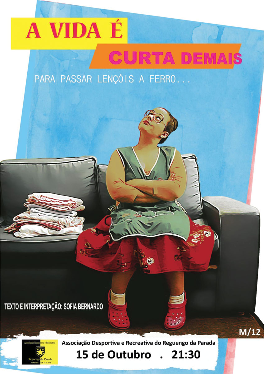 A Associação Desportiva e Recreativa do Reguengo da Parada (Tornada) acolhe no sábado dia, 15 de outubro, pelas 21h30, a peça “A vida é curta demais para passar os lençóis a ferro”, de Sofia Bernardo. A atriz é também a autora do próprio texto desta peça onde se aborda a questão de ser empregada doméstica. A caldense é também comediante, faz stand-up e dá aulas de teatro no Conservatório das Caldas da Rainha.
