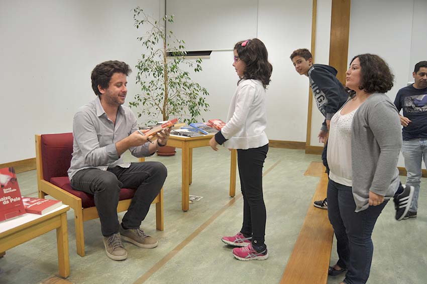 São 21h00 e o auditório da biblioteca tem as primeiras filas ocupadas. Há crianças entre os presentes. “São alunos das escolas que trabalharam com David Machado durante o dia e que pediram aos pais para regressar ao serão”, explicou a bibliotecária Aida Reis, acrescentando que vieram alunos do 1º ciclo das escolas EB de Sto Onofre e da Escola do Parque enquanto que, à tarde, foi a vez de EB1 do Bairro da Ponte. Todos tinham trabalhado livros deste autor.