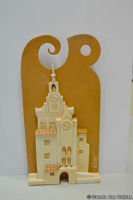 O autor explicou que a peça “Caldas” é uma placa alusiva à própria cidade e é feita em barro vermelho, tendo aplicado elementos em barro branco. Estes representam elementos arquiectónicos da cidade como a Torre da Igreja do Pópulo.