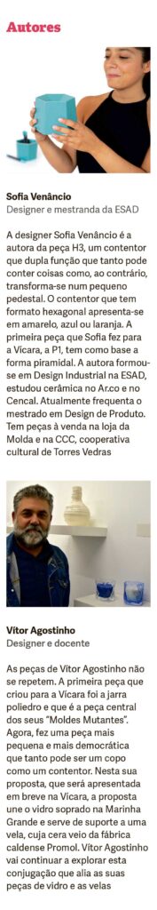 No último fim de semana de novembro, a Vícara vai realizar uma sessão de apresentação de novas peças de Vítor Agostinho, autor que trabalha nos Silos e que criou peças feitas em vidro na Marinha Grande e que podem ser copos, sendo por agora originais velas, feitas na Promol.