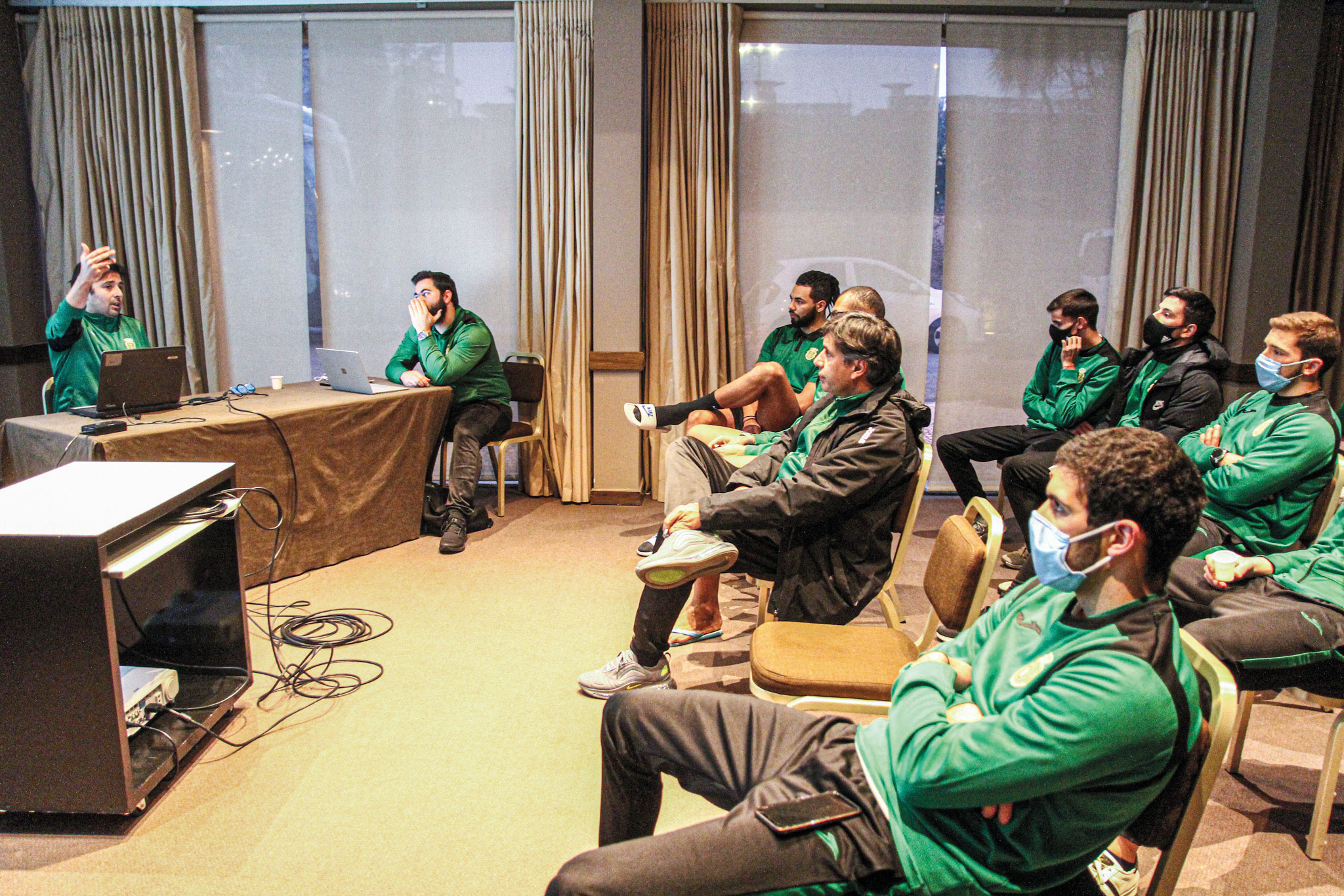 O grupo volta a reunir-se pelas 18h00, a três horas do jogo, para a palestra na qual é analisada a equipa da Fonte, através de vídeos preparados horas antes pelo técnico de análise estatística, Bruno Cunha. Esta análise permite identificar os movimentos mais fortes, e também os menos fortes, de cada elemento da equipa adversária, assim como a melhor forma de os defender e controlar. É um momento interativo, no qual os jogadores também apresentam as suas ideias.