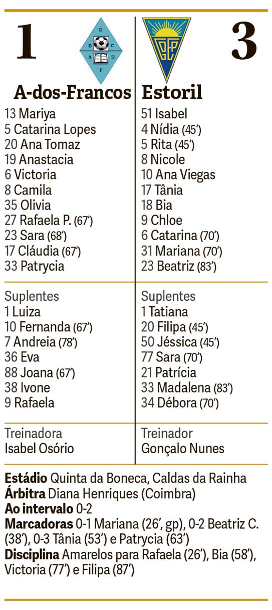 O A-dos-Francos pressionava na frente, mas acabou por destapar atrás, deixando muito espaço nas costas da defesa para o ataque canarinho explorar no contra-golpe. E foi assim que, aos 53’, apareceu o terceiro para as forasteiras, com Tânia Rodrigues a desmarcar-se na direita e a ficar cara-a-cara com a guarda-redes caldense, atirando a contar. Dez minutos volvidos, a resposta das pupilas de Isabel Osório: cruzamento da esquerda e Patrycia Ferreira, de cabeça e como mandam as leis – de cima para baixo -, reduziu e deu esperança ao A-dos-Francos.