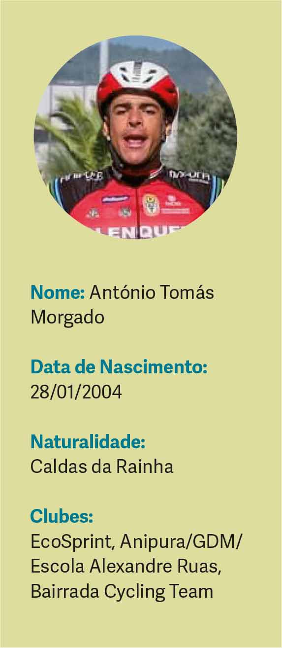 O jovem ciclista, natural de Salir do Porto e que em janeiro completa 17 anos, terminou a segunda época no escalão de cadetes com um conjunto muito assinalável de resultados ao serviço da Anipura GDM Escola de Ciclismo Alexandre Ruas, de Alenquer. Entre esses, António Morgado destaca dois. A vitória em março no Tour de Villemur, na região de Toulouse (França), na qual, além da geral, venceu o contrarrelógio e a primeira de duas etapas em linha. E a vitória numa etapa da Vuelta Ciclista al Basaya, na Cantábria, Espanha, onde foi segundo da geral, em agosto. A época foi coroada com chave de ouro com a conquista dos títulos nacionais de contrarrelógio e de estrada.