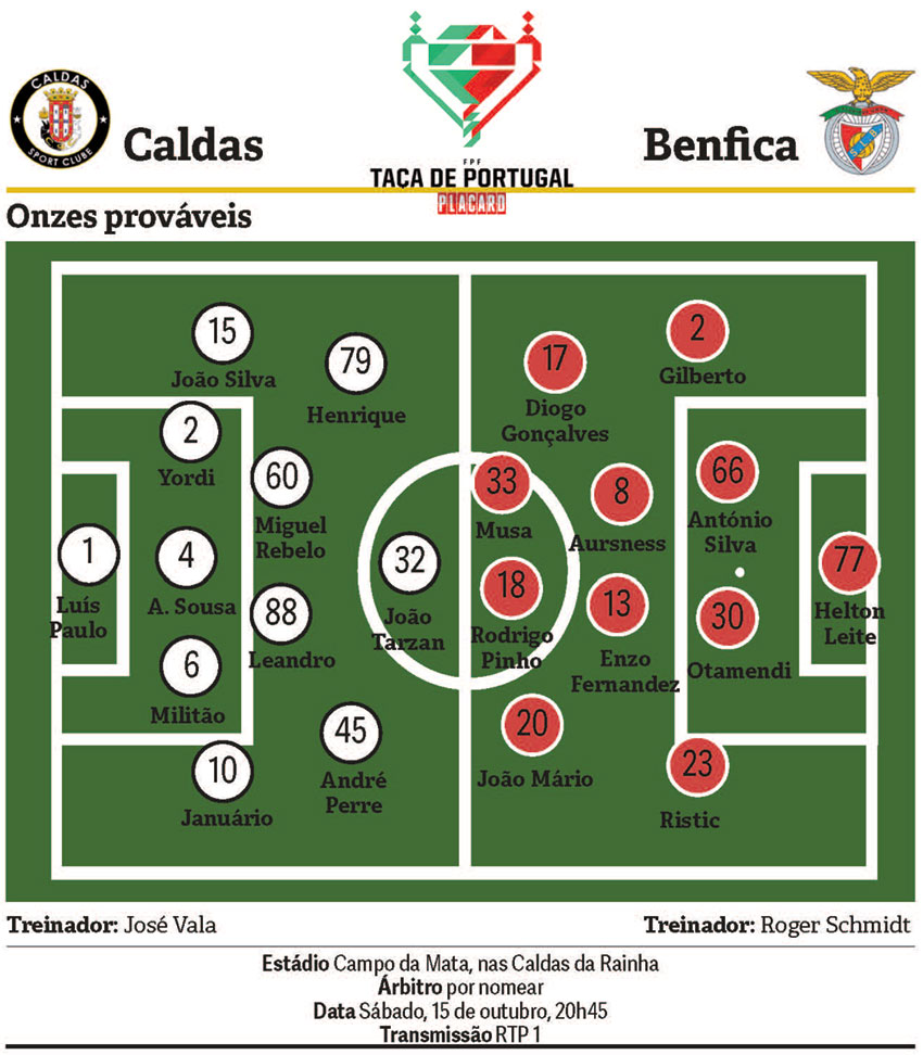 De resto, o encontro da Taça com o Caldas surge num mês de outubro em que o clube da Luz tem calendário sobrelotado. E se o técnico alemão ainda terá uma semana para preparar o Clássico com o FC Porto, o jogo com o Caldas surge apenas três dias depois da partida em Paris contra o PSG, para a Liga dos Campeões, pelo que deverá haver alguma gestão de esforço do plantel, ainda que algumas das peças fundamentais da equipa possam atuar nas Caldas.