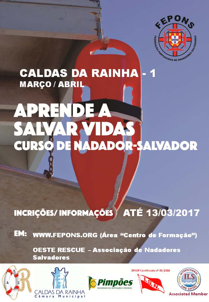 A Associação de Nadadores Salvadores irá realizar a promoção da formação profissional de Nadadores Salvadores para o ano de 2017, na cidade de Caldas. Serão efetuadas apresentações do assunto em questão nas seguintes escolas secundarias: Rafael Bordalo Pinheiro, Raul Proença, Rainha Dona Leonor e ETEO, visando a formação profissional e a projeção no mercado de trabalho, para além das entidades supra referidas outras à a referenciar, nomeadamente, o município de Caldas a Federação Portuguesa de Nadadores Salvadores e o Instituto de Socorros a Náufragos.