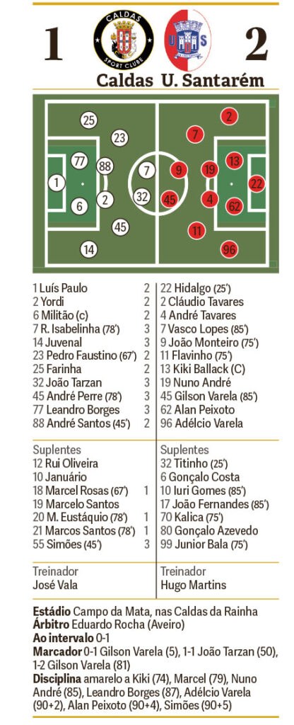 A U. Santarém venceu nas Caldas (1-2) e ganhou margem na atual luta entre as duas formações pelo terceiro lugar. A equipa de Acácio Santos soube explorar os corredores laterais de forma exímia e construiu por aí um triunfo importante e que deixa o Caldas em alerta para as próximas jornadas.