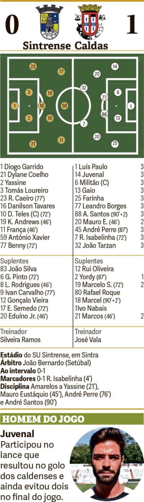 Ao intervalo, José Vala colocou Marcos no lugar de Mauro Eustáquio para travar o jogo mais lateralizado do Sintrense e explorar alguma velocidade com a bola. Mas foi sobretudo com remates de meia distância, por Ricardo Isabelinha, André Perre e Marcos Santos, que o Caldas se voltou a aproximar da baliza de Diogo Garrido.