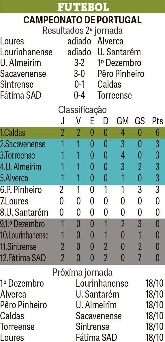 Na parte final do primeiro tempo, o Sintrense começou a insistir pelos corredores, sobretudo o direito, e voltou a criar perigo nas combinações entre França e António Xavier, mas a defensiva caldense não permitiu finalizações.
