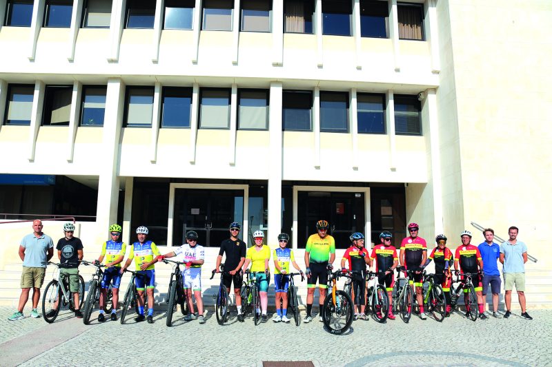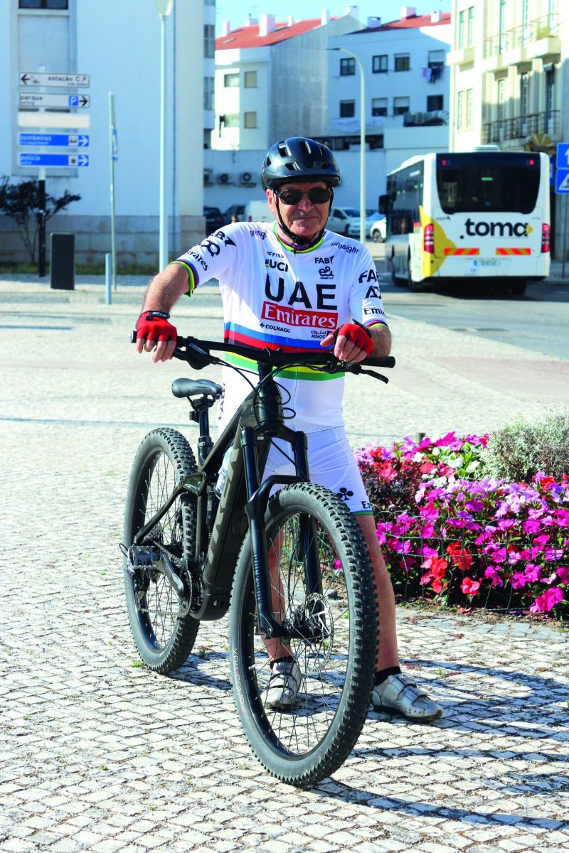 O primeiro a chegar ao ponto de encontro foi… Tadej Pogacar, perdão, António Cipriano que vem vestido à Pogacar! “Sou um grande fã e vim prestar homenagem a ele e ao João Almeida, é um orgulho ver dois caldenses, ele e o António Morgado, a este nível”, conta-nos, antes da partida, enquanto iam chegando mais participantes. Foi sempre amante de ciclismo, participou várias vezes no Caldas-Badajoz e no Circuito Alves Barbosa, mas também na Rota da Sopa da Pedra, por exemplo. Hoje, com 72 anos e reformado, anda todos os dias de bicicleta. Veio do Casal do Frade para fazer o aquecimento… “O João merece que façam este tipo de iniciativas”, conclui.