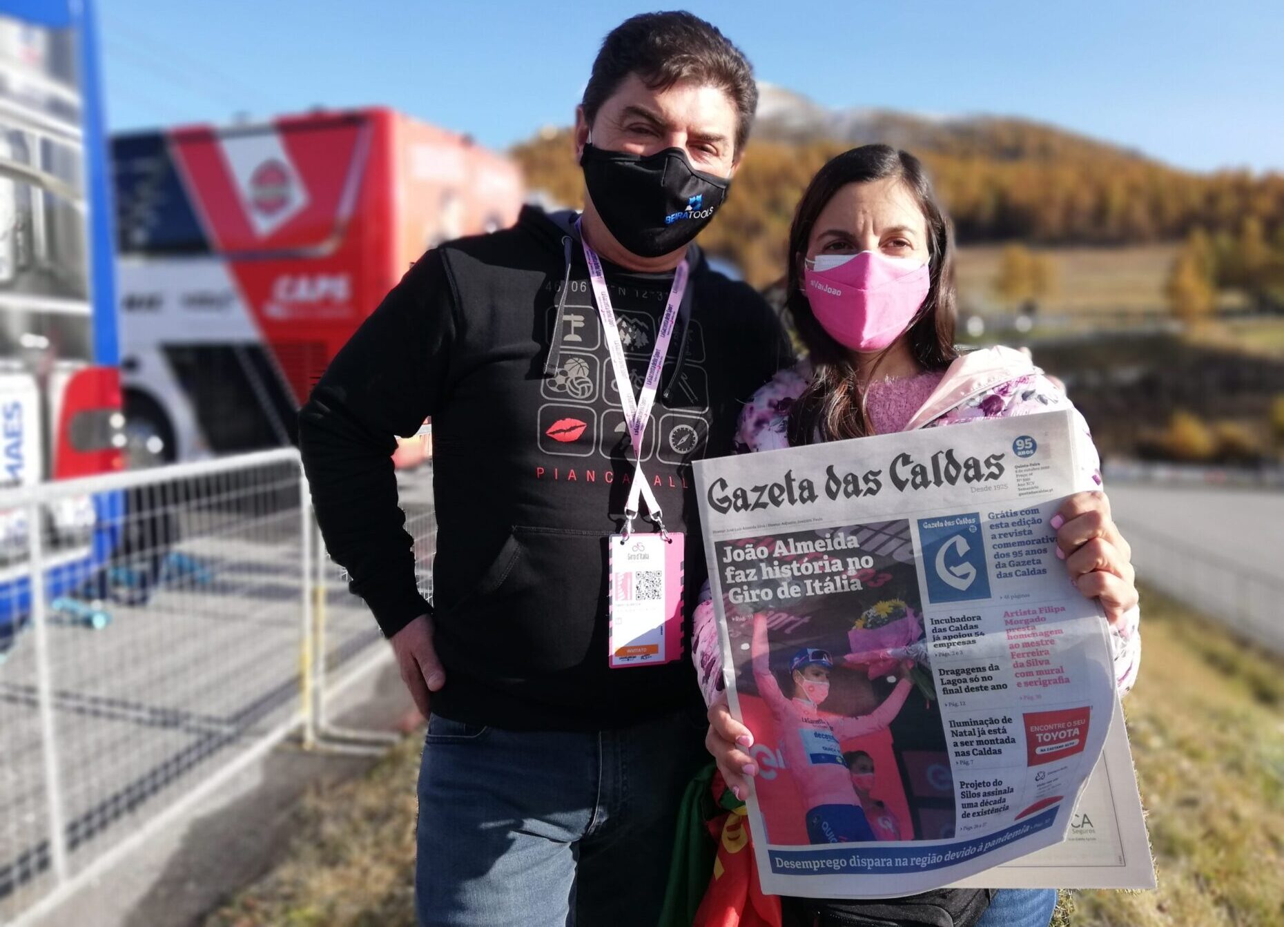 “De rosa ou seja de que cor for, ele conquistou muita gente e trouxe alegria à vida das pessoas num momento muito difícil. Acabasse como acabasse, queríamos estar aqui com ele”, afirmou a mãe do ciclista, exibindo, com o marido, Dário Almeida, a edição da Gazeta das Caldas de 8 de outubro, em que João Almeida fez manchete.