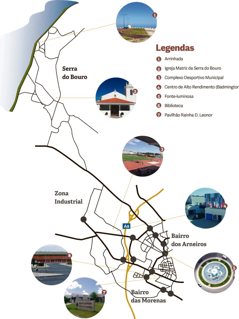 Além do belíssimo Miradouro da Arrinhada, a Serra do Bouro destaca-se pela paisagem e pela ligação ao mar, nomeadamente na Estrada Atlântica, com vistas panorâmicas para o vale tifónico de Óbidos/Caldas da Rainha e para o oceano Atlântico.