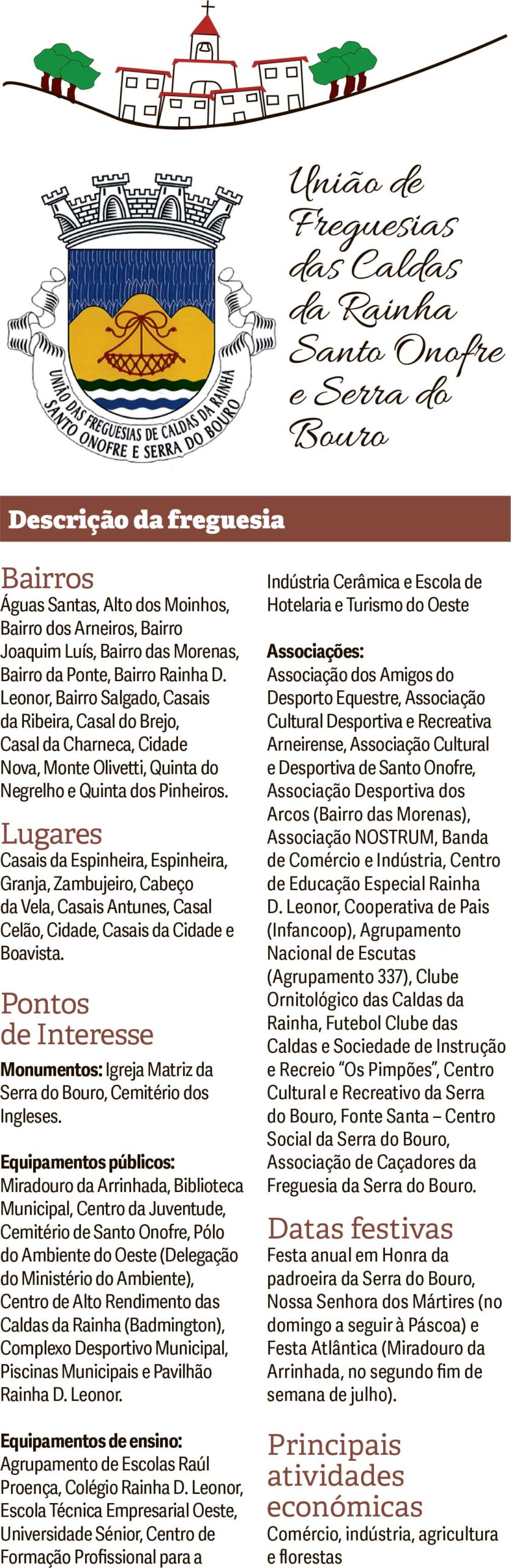 Reunindo os territórios das antigas freguesias de Santo Onofre (no centro da cidade) e Serra do Bouro (onde convergem o campo e o mar), a União de Freguesias das Caldas da Rainha Santo Onofre e Serra do Bouro é uma das “novas” freguesias do concelho, criadas em 2013, aquando do processo de reorganização administrativa do país. Esta mudança justificou, de resto, uma alteração nos limites das antigas freguesias para que houvesse continuidade territorial.