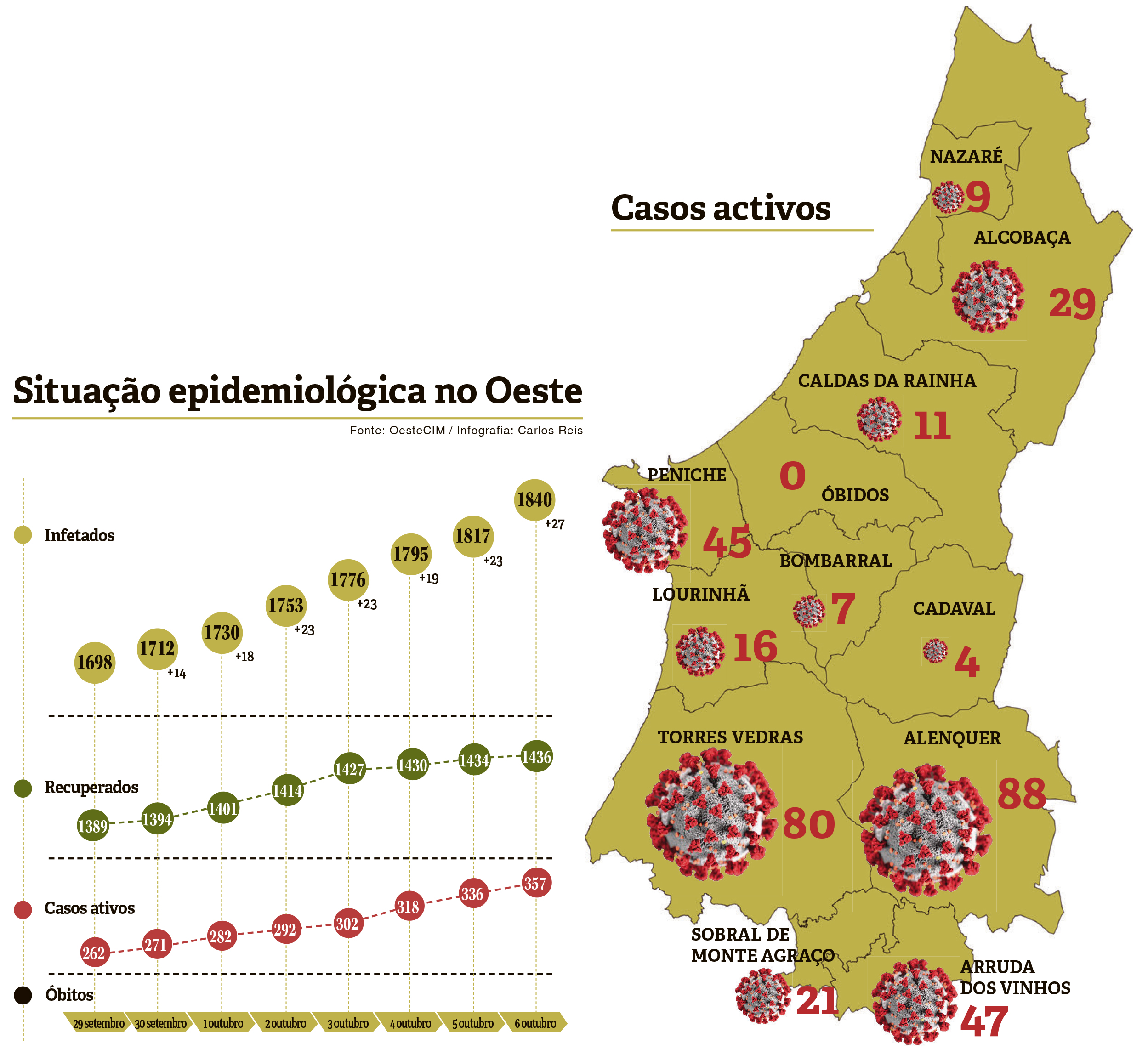 A taxa de infeção, calculada através da divisão do número de casos ativos pelo total da população (segundo os dados dos Censos 2011), subiu no Oeste e atingiu os 0,98 casos por cada milhar de habitantes (na última semana era de 0,72).
