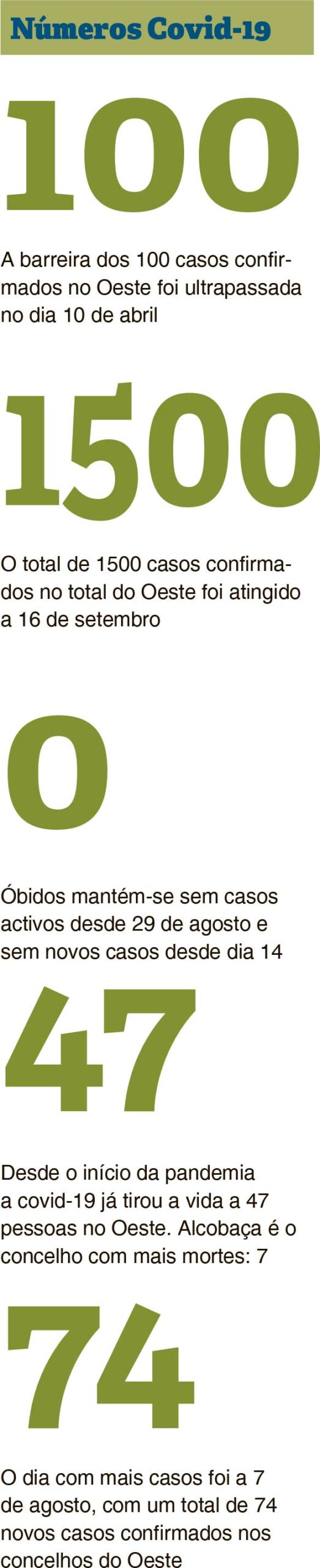 Óbidos tem ainda a particularidade de ser o único município sem casos ativos. Naquele concelho não se registam novos casos confirmados de covid-19 desde o dia 14 de agosto.