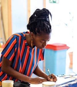 “Chegaram a mim pelo trabalho que tenho desenvolvido com as fibras vegetais”, disse a designer que neste projeto trabalhou com vime e em parceria com Alcídio Andrade, artesão dos Açores. A este material juntou a pedra vulcânica que é o basalto. “O conceito foi desenvolvido nos Açores, inspirado na paisagem dos vinhedos da ilha do Pico”, contou a autora que desenvolveu cinco peças para a BROOT e que estão agora a ser apresentadas em feiras internacionais. Desenhou um banco, uma cadeira, um candeeiro, uma fruteira e um vaso-cesto. “Foi a primeira vez que fiz algo com este alcance e também me estreei a trabalhar a pedra”. Estas obras têm sido apresentadas em certames internacionais na Arábia Saudita, Milão, Paris e Nova Iorque. Eneida Tavares – que já participou em exposições colectivas pela Europa, Brasil e Cabo Verde – aceitou um outro o desafio e está a experimentar a cenografia. Está a trabalhar na performance “Úlulu”, criação da poeta e artista transdisciplinar Raquel Lima. “Tem sido um processo desafiante, fluído e de muita aprendizagem, onde integrei materiais e processos das minhas práticas”, contou a autora acrescentando que Úlulu quer dizer placenta em forro ou lúngwa santomé. Segundo um ritual antigo da cultura são-tomense,” o úlulu é plantado, juntamente com o cordão umbilical, no grande quintal da família”. Assim, segundo as gerações mais antigas, as crianças crescem e viajam pelo mundo mas sabem sempre regressar à terra onde nascem.