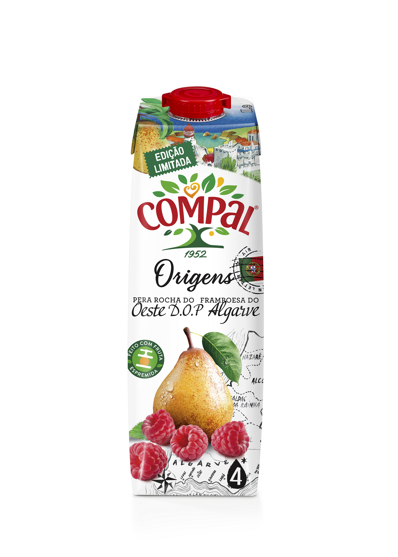 O novo Compal “nasce da doce combinação entre uma pera de polpa branca e macia, granulosa e doce, a Pêra Rocha do Oeste DOP, e da Framboesa do Algarve, que mais a sul, é fruta abençoada pelo sol, muito suculenta e ligeiramente ácida”.