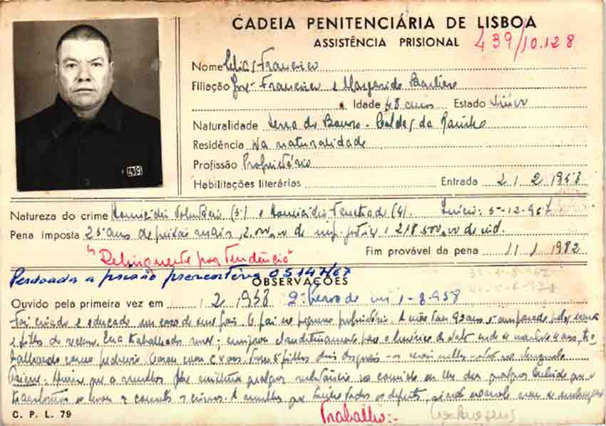 Elias Francisco entrou na Cadeia Penintenciária de Lisboa a 1 de Fevereiro de 1958, com o número 439, depois de ter estado 18 meses na prisão das Caldas.