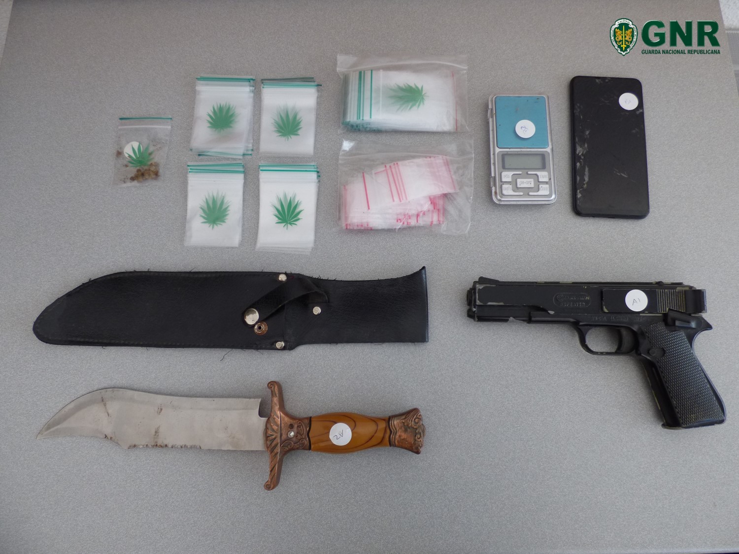As detenções decorreram em sequência de quatro buscas, três delas domiciliárias e uma em veículo, que para além das detenções permitiram apreender uma réplica com configuração de arma de fogo, uma faca com 21 cm de lâmina, um telemóvel, uma balança digital, 1,45 gramas de folhas de cannabis e vários sacos para acondicionamento de produtos estupefaciente.