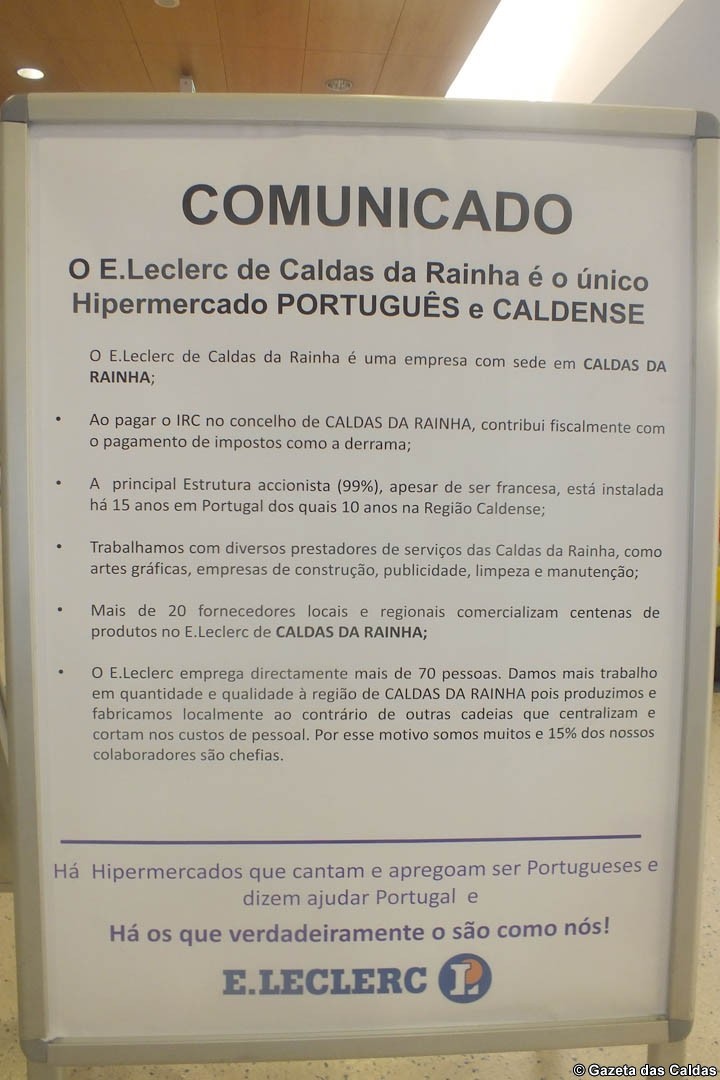 O E. Leclerc das Caldas da Rainha aproveitou a recente polémica em torno da venda de participações do maior accionista da Jerónimo Martins (grupo que detém os supermercados Pingo Doce) à subsidiária da empresa na Holanda, para relembrar os seus clientes que tem sede nas Caldas da Rainha.