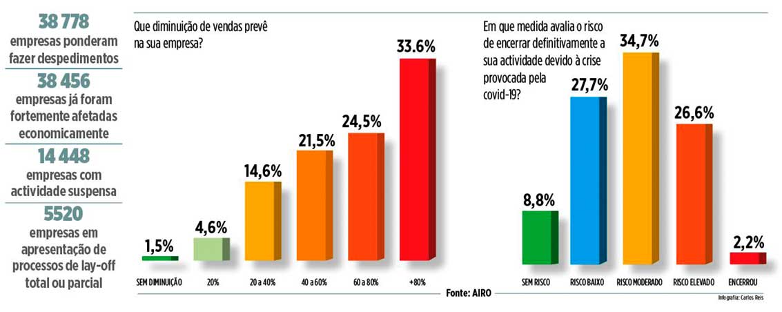 Cerca de 65% dos entrevistados referem um risco moderado ou elevado de encerrar definitivamente a empresa (ou já encerraram). Mais de metade estima que as quebras nas vendas fiquem acima dos 60% e um terço prevê mesmo que fiquem acima dos 80%. Apenas cerca de 20% refere quebras inferiores a 40%.
