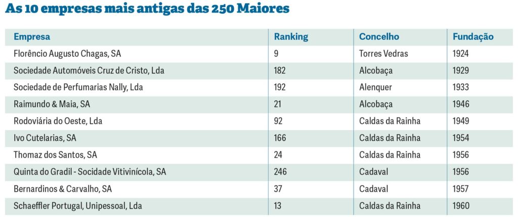 Caldas da Rainha tem quatro empresas entre as mais antigas do Oeste. Alcobaça e Cadaval apresentam duas, enquanto Alenquer e Torres Vedras têm uma entidade no top 10