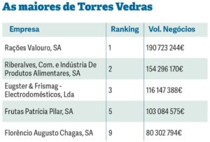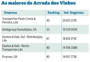 Estes são os quatro concelhos que se destacam na região pela dimensão empresarial. Atrás destes, mas já com alguma distância, surgem Lourinhã e Arruda dos Vinhos, com 17 e 16 empresas, respetivamente. O conjunto de empresas lourinhanenses apresentaram um volume de negócios de 302,5 milhões de euros, enquanto as de Arruda dos Vinhos atinge os 177,7 milhões.