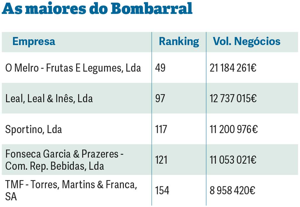 O Bombarral é o oitavo concelho com mais empresas na lista, com sete. O total do volume de negócios das empresas do concelho que entras nas 250 Maiores do Oeste é de 81,1 milhões de euros.