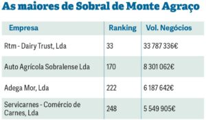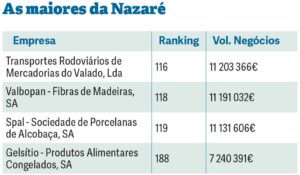 Com o mesmo número de empresas, quatro, fecham o ranking de concelhos Sobral de Monte Agraço e Nazaré. O concelho do distrito de Lisboa regista 53,8 milhões de euros em faturação no seu grupo de empresas, enquanto Nazaré fecha a lista com 40,8 milhões de euros.
