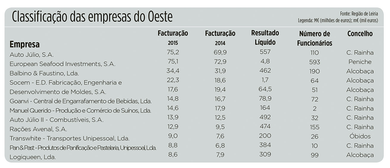 No total, a região Oeste está representada por 12 empresas que obtiveram, no seu conjunto, vendas no valor próximo dos 307 milhões de euros, mais 15 milhões de euros do que tinham facturado em 2014, e lucros a rondar os 9,7 milhões de euros.