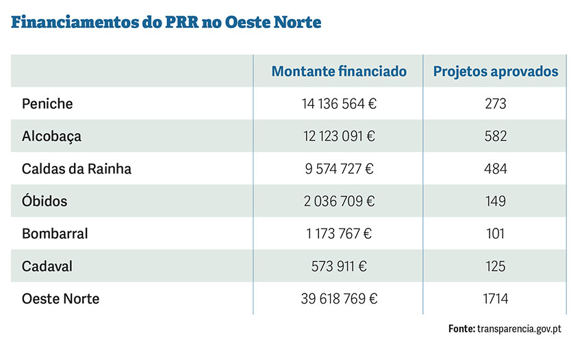 O PRR já aprovou 1714 projetos no Oeste Norte, com um financiamento total de 39,6 milhões de euros, segundo o portal transparencia.gov.pt, que serve de monitorização à “bazuca” europeia.