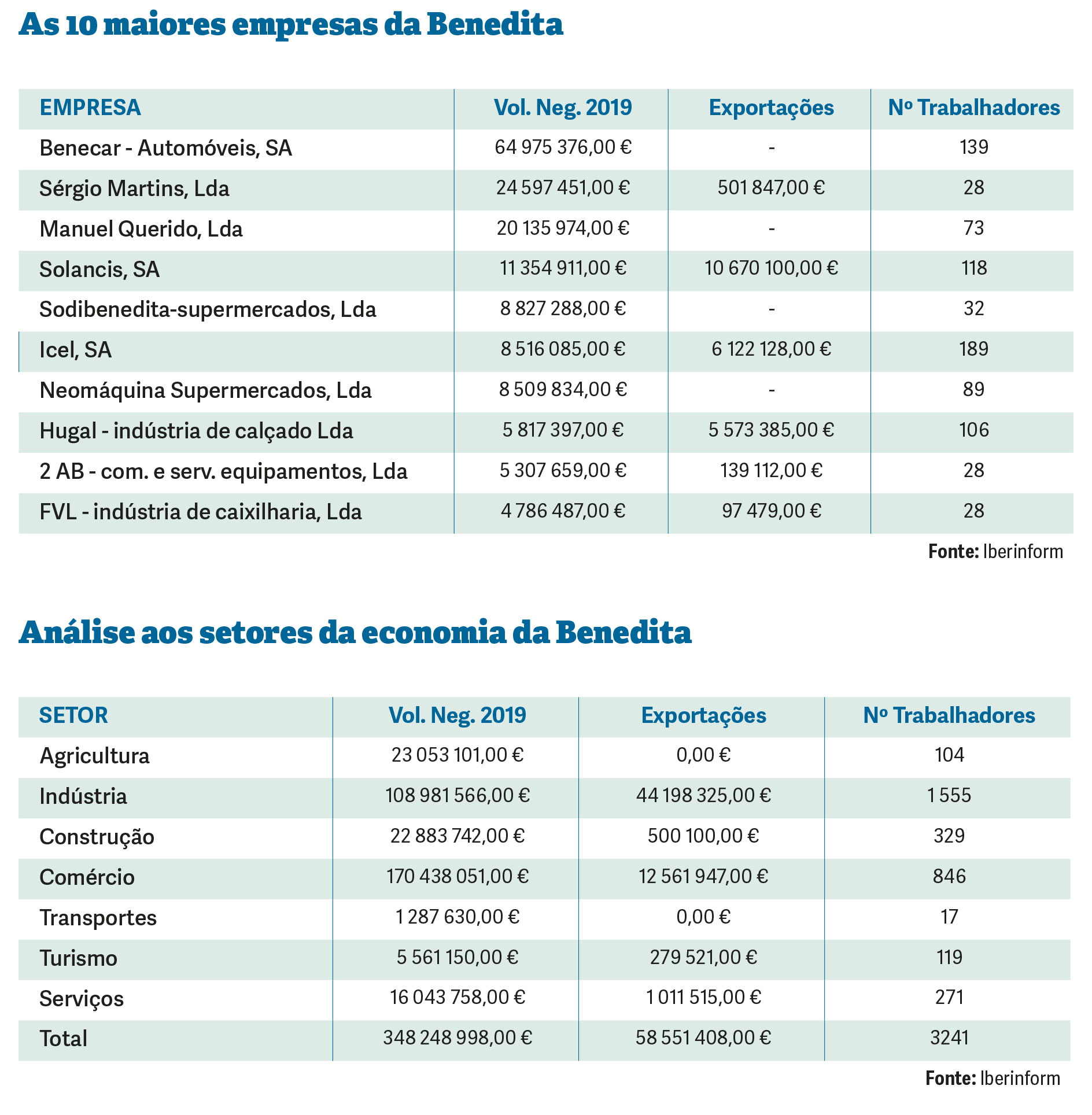 Neste top das maiores empresas da Benedita estão ainda a Solancis, a Sodibenedita – Supermercados Lda, que gere o Intermarché da vila, a Icel, a Neomáquina Supermercados, a Hugal, a 2AB e a FVL – Indústria de Caixilharia.