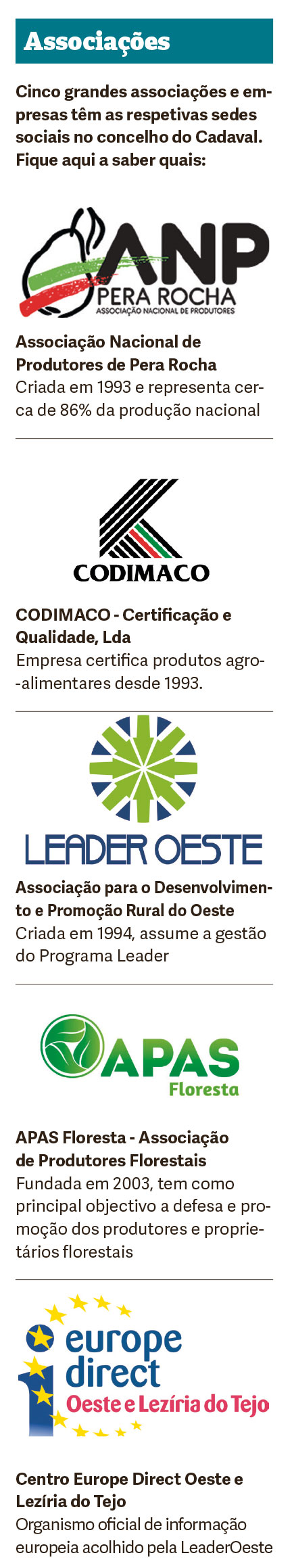Outro caso relevante foi a constituição da CODIMACO, que evoluiu de uma associação de certificação na área da fruticultura, em 1993, para uma empresa de certificação independente, em 2008, para certificar produtos agroalimentares. Tem como missão assegurar o cumprimento de referenciais normativos nacionais e internacionais, assim como os requisitos de mercado e de várias cadeias de retalhistas. A CODIMACO faz a avalização e certificação da Pera Rocha do Oeste (DOP), Maçã de Alcobaça (IGP), Mel da Serra da Lousã (DOP), Queijo Rabaçal (DOP), Ginja de Óbidos e de Alcobaça (IG), para além de produtos agrícolas obtidos através do cultivo em modo de Proteção Integrada. Reconhecida oficialmente pelo Ministério da Agricultura, a empresa está acreditada pelo IPAC – Instituto Português de Acreditação. Com sede no Cadaval, tem também protocolos privados com grupos empresariais da área do retalho alimentar, como o Clube de Produtores Continente e Vida Auchan – Qualidade Sustantável. Assegura, ainda, serviços para a exportação de frutas e vegetais, condições de trabalho e boas práticas sociais, entre outras áreas.