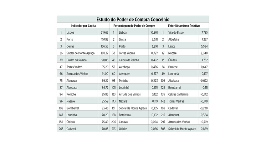 Há três concelhos do Oeste entre os 50 com melhor índice de poder de compra e um deles é o das Caldas da Rainha, que surge em 39º. Sobral de Monte Agraço é dos concelhos da região o melhor colocado na lista e o único acima da média nacional. O Oeste manteve em grosso modo os índices de há dois anos, mas perdeu um lugar para o Cávado e encerra agora o top 10 entre as 22 regiões do país.