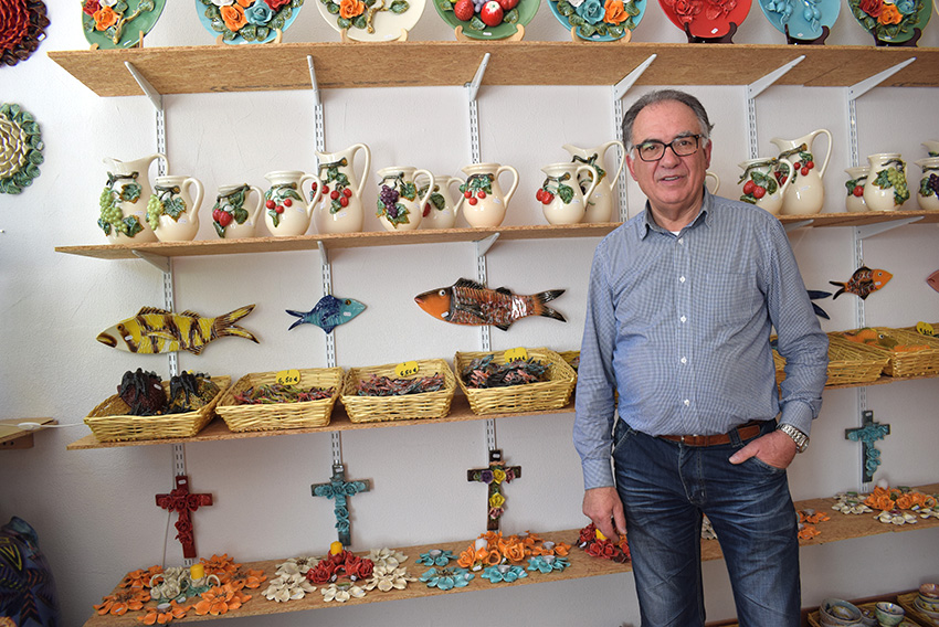 As peças de Carlos Martins têm tudo a ver com a cerâmica caldense. “Era o que se fazia antigamente”, explicou o ceramista que decora grandes pratos e jarrões com animais, frutas e flores, como determina a tradição local. Também tem à venda pequenas peças, como peixes e andorinhas.