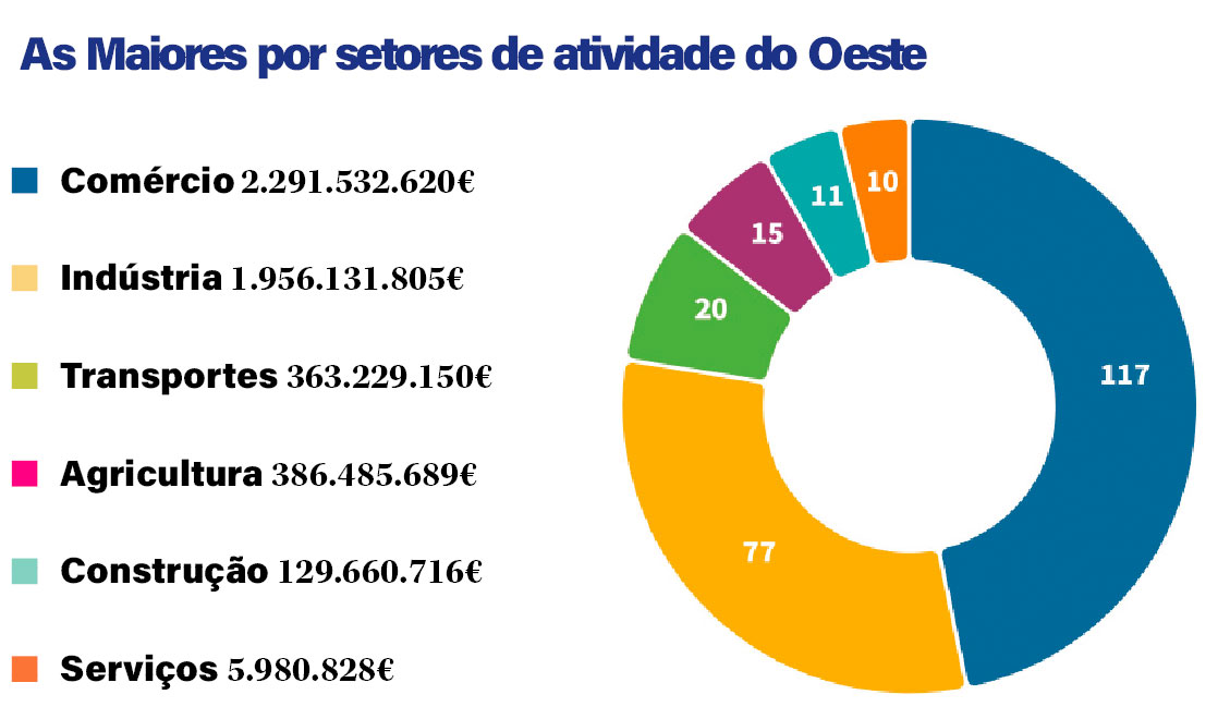 Em número de empresas nas 250 Maiores, o comércio concentra 117 empresas (46,8% do total), menos 7 do que no passado, enquanto a indústria perdeu 3, para as 77. Os restantes não se aproximam dos dois setores líder. Transportes (20) e agricultura (15) perderam representatividade na lista, enquanto a construção (11) manteve o mesmo número e os serviços (10) adicionaram duas empresas.