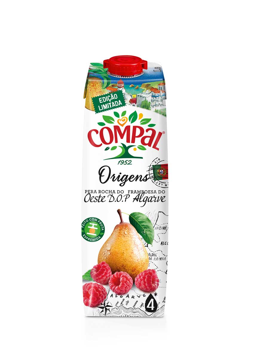 O novo Compal “nasce da doce combinação entre uma pera de polpa branca e macia, granulosa e doce, a Pêra Rocha do Oeste DOP, e da Framboesa do Algarve, que mais a sul, é fruta abençoada pelo sol, muito suculenta e ligeiramente ácida”.
