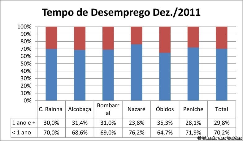 Mas se analisarmos mais de perto os dados de Dezembro de 2011 verificamos que a maioria dos desempregados tem menos de um ano de registo nos centros de emprego, variando entre os 64,7% de Óbidos e os 76,2% da Nazaré. Significa que presentemente o desemprego de longa duração nesta região tem uma incidência de menos de um terço do total dos desempregos.