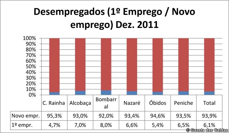 Também pelos dados de Dezembro passado a maioria dos desempregados anda à procura de novo emprego, enquanto que só um número residual (inferior a 8% no caso do Bombarral, mas a 7% nos restantes) anda à procura do primeiro emprego.