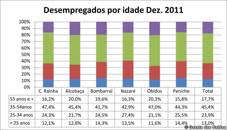 Da mesma forma esta estatística permite verificar que a maioria dos desempregados nesta região está no grupo entre os 35 e os 54 anos de idade (entre 41% e 47,5%) enquanto que no primeiro escalão até aos 25 anos o número de desempregados nestes concelhos não ultrapassa os 14,4%, tal como os desempregados com mais de 55 anos não ultrapassa os 20%.