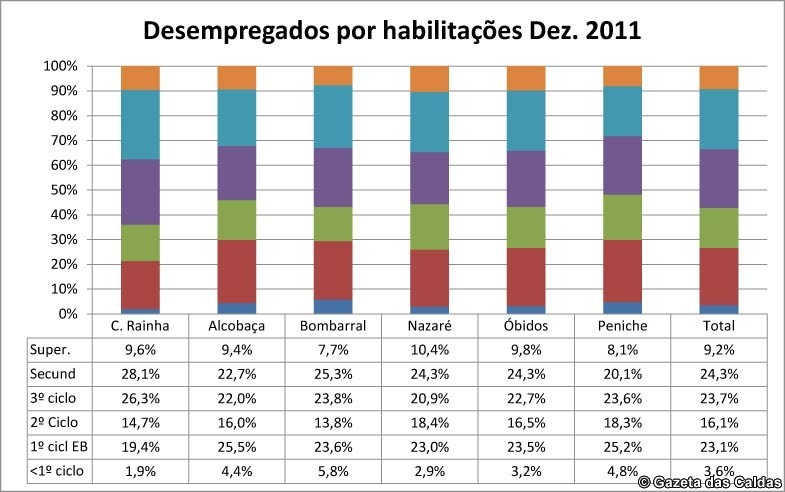 O número de desempregados com o curso superior atinge valores muito elevados, ultrapassando as oito centenas e meia, ultrapassando na Nazaré os 10% do número total de desempregados, enquanto que nas Caldas, Alcobaça, Óbidos e Peniche está próximo dos 10%.