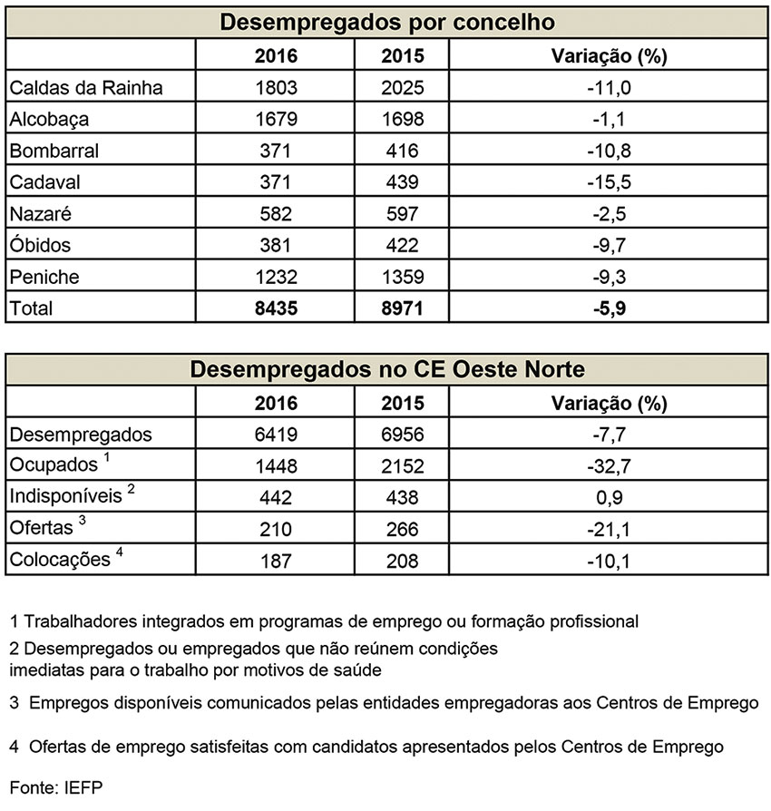 O desemprego diminuiu 11% nas Caldas da Rainha durante o ano de 2016 e 7,7% em toda a região Oeste Norte. Durante o ano passado o número de desempregados registados no IEFP na região manteve a tendência de descida iniciado em 2013 e é preciso recuar a 2007 para encontrar melhores registos. Há, no entanto, um dado preocupante: o desemprego entre os jovens aumentou, o que não acontecia desde 2013.