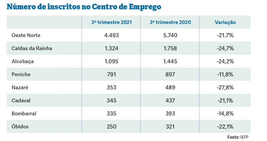 O centro que abrange os concelhos das Caldas da Rainha, Óbidos, Alcobaça, Nazaré, Bombarral, Cadaval e Peniche terminou o terceiro trimestre do ano com 4.493 inscritos à procura de emprego, menos sete do que em março de 2020, mês em que a pandemia de covid-19 começou a afetar a atividade das empresas.