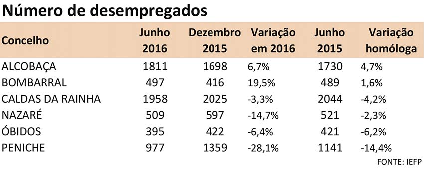 Os dados do desemprego nas Caldas da Rainha divulgados pelo Instituto do Emprego e da Formação Profissional (IEFP) indicam uma descida de 3,3% do número de desempregados no concelho durante o primeiro semestre de 2016, e de 4,2% entre os meses de Junho de 2015 e de 2016. No distrito, só em Alcobaça e no Bombarral o número de desempregados aumentou.