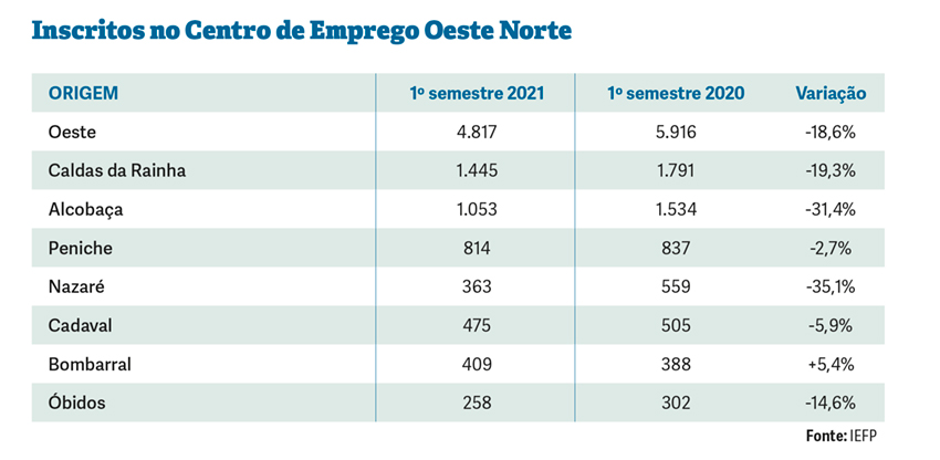 No conjunto dos concelhos das Caldas da Rainha, Alcobaça, Peniche, Nazaré, Cadaval, Bombarral e Óbidos, havia no final de junho 4817 inscritos à procura de emprego, menos 1099 do que no mês homólogo do ano passado, e menos 954 do que em fevereiro do ano passado, o último sem pandemia e que serve de referência para medir a destruição de empregos na região no período pandémico.