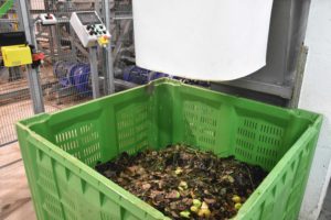 As folhas e ramos de árvore que vêm dentro das caixas de fruta que chegam à central são recolhidas para compostagem. A organização desenvolveu uma máquina onde, além destes resíduos, também coloca fruta podre e relva do jardim, que depois são triturados e ficam em depósito durante algumas semanas até se transformar em composto orgânico.