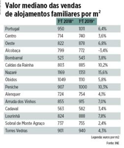O valor mediano das vendas de habitações valorizou 10,2% nas Caldas da Rainha no espaço de u m ano, segundo dados do INE para o primeiro trimestre de 2019. Dentro da região Centro, o Oeste é a subregião onde o preço é mais elevado, à frente de Coimbra e Aveiro. Há mesmo três concelhos do Oeste (Nazaré, Óbidos e Peniche) em que a mediana é superior aos 1000 euros por m2.