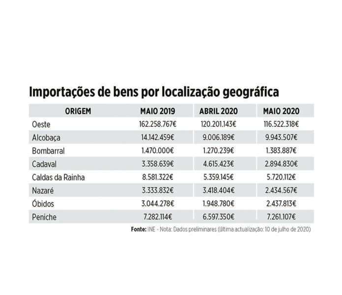 As importações no Oeste continuam a descer e, comparando com o mês de Maio do último ano, foram importados menos 45 milhões de euros de bens. Ainda assim, já há concelhos a importar mais do que em Abril deste ano (penúltimo mês com dados disponíveis)