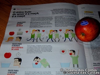 Quem comprou a edição daquele jornal nacional na passada segunda-feira, Dia dos Namorados, recebeu uma Maçã de Alcobaça de oferta. Nas páginas interiores do jornal três divertidos testes desafiavam os casais a testar a sua ligação amorosa. Uma brincadeira com um objectivo muito sério: “a divulgação e promoção da Maçã de Alcobaça enquanto Produto Português Qualificado, sensibilizando os jovens portugueses para hábitos de consumo, preferindo produtos portugueses”. Um estímulo para a economia nacional que ajuda os jovens a “obterem um futuro mais promissor e com mais oportunidades”, anunciou a APMA.