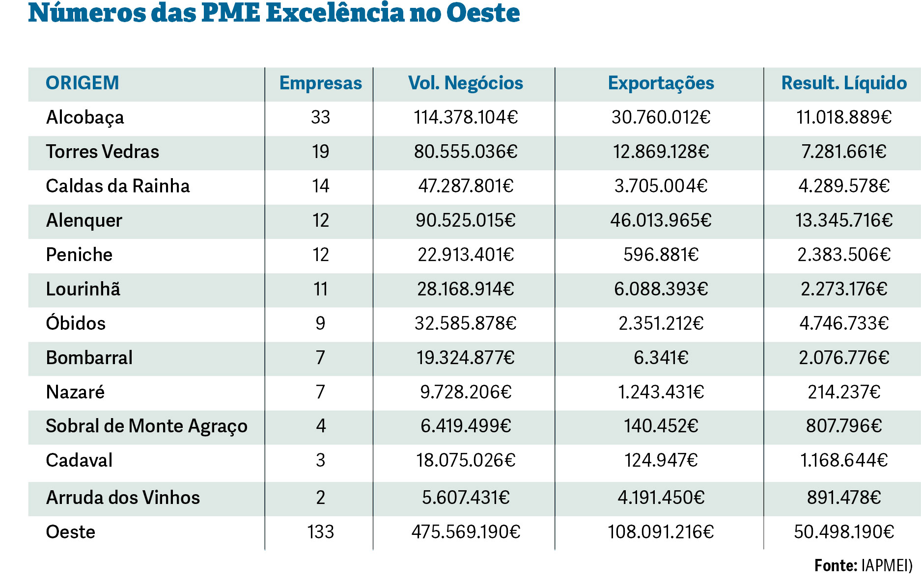 Por concelhos, Alcobaça continua a liderar em número de empresas PME Excelência e há a destacar que os 12 concelhos do Oeste estão representados na lista, o que não aconteceu na edição do ano passado.